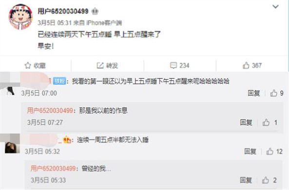 翻看周扬青3月5日发的微博似乎也能够发现她的变化,她在文中称自己已经连续两天下午五点睡,早上五点醒来了。当时有粉丝还特别疑惑的评论称:“我看的第一眼还以为早上五点睡下午五点醒来呢。”她随后回复:“那是我以前的作息。”尔后有粉丝称自己连续一周五点半都无法入睡,她感慨称:“曾经的我。”