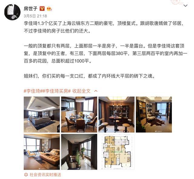 3月5日,有微博房产博主爆料称,李佳琦花1.3亿在上海云锦东方二期购置豪宅,一套顶楼复式,与著名艺人胡歌、唐嫣做了邻居。