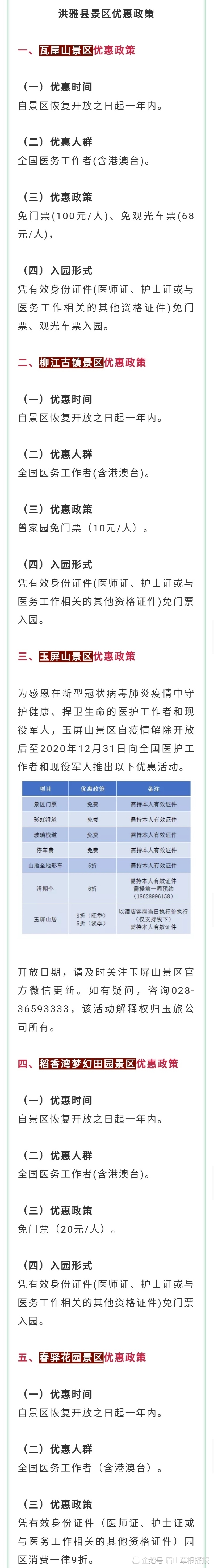 根据《四川省应对新型冠状病毒感染肺炎疫情应急指挥部关于进一步推进分区分类防控工作的通知》(川疫指发〔2020〕24号)和《四川省新型冠状肺炎疫情防控期间旅游景区开放工作指南》(川旅景协〔2020〕8号)要求,对照《眉山市应对新型冠状病毒肺炎疫情应急指挥部办公室关于做好全市文旅行业有序恢复营业有关事项的通知》标准,经县疫情防控指挥部同意,洪雅县瓦屋山、柳江古镇、七里坪旅游度假区、槽渔滩风景名胜区、玉屏山景区、稻香湾梦幻田园景区、春驿花园景区自2020年3月8日起,面向四川省内、国内疫情防控低风险地区正式恢复开放。