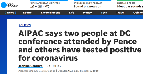 “今日美国”称,AIPAC向与会者、发言人、政府和国会山办公室发表的最新声明中说,感染新冠病毒的两人此前从纽约前往华盛顿特区出席3月1日至3日的会议。