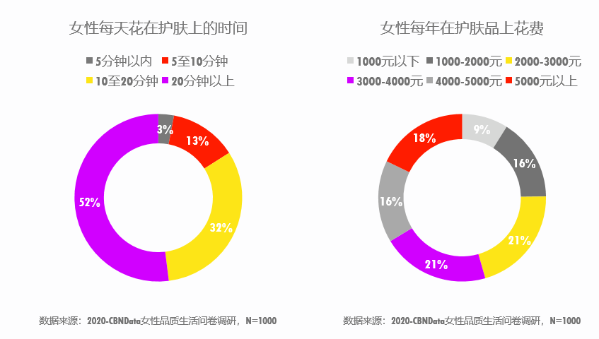 CBNData《报告》指出,近两年内,护肤、口服美容等与颜值相关的品类带动万亿级的消费增长,其中洗脸仪、按摩仪、蒸脸仪等高科技美容仪备受青睐。55%的女性每年护肤品花费超过3000元,超过半数的女性每天花在护肤上的时间超过20分钟。