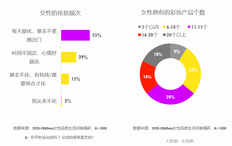 CBNData《报告》显示,越来越多的女性开始关注对自己外在形象的话语权,近年来彩妆消费需求强劲。55%的女性每天化妆,64%的女性拥有10件以上的化妆品。