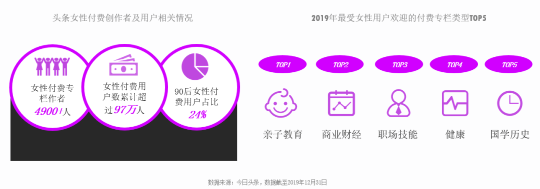 同时,越来越多的女性读者开始愿意为优质内容买单。以今日头条为例,截至2019年底,全年平台女性付费专栏作者近5000人,女性付费用户有近百万,其中90后占24%。在所有的付费专栏里,亲子教育、商业财经和职场技能类专栏最受女性用户喜欢。