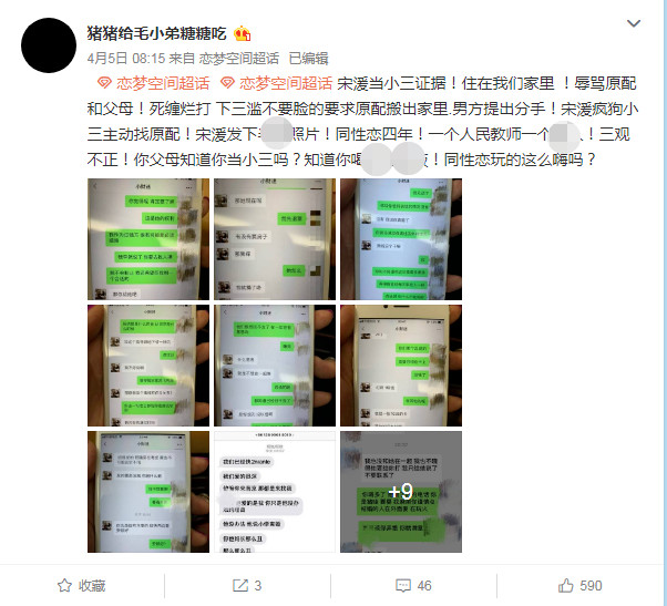 除此之外,博主还晒出了宋湲和男方的露骨聊天记录,内容不堪入目,其中还提到了离婚以及要房子,还晒出了疑似宋湲发给原配的挑衅短信,另外宋湲还被曝出了曾是同性恋。