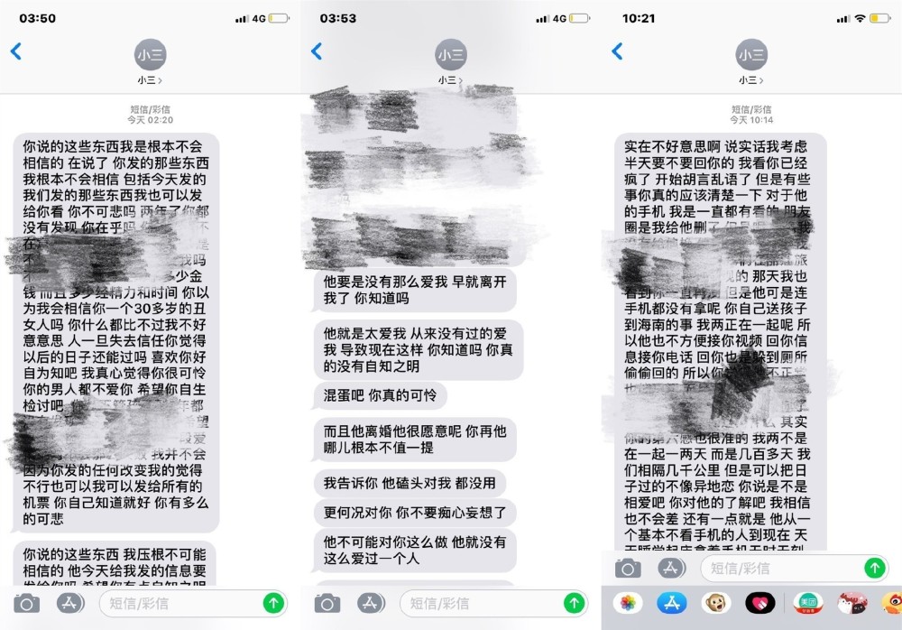 短信内容称她和男方在一起两年了,辱骂原配长得很丑,一直都称她和男方是因为相爱才在一起的。