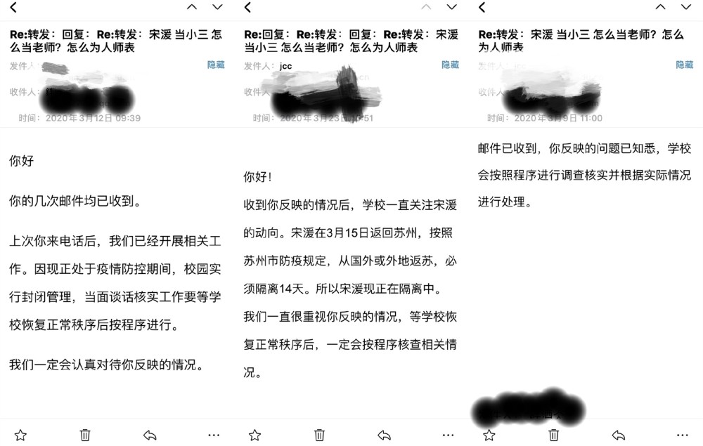 另外,男方家人还晒出了将宋湲的情况反馈给宋湲所在学校的邮件回复截图,从回复中得知,男方家人曾多次向宋湲任职的学校反馈情况,宋湲任职的学校回复称已经展开相关调查,并会根据调查的核实的实际情况进行处理。