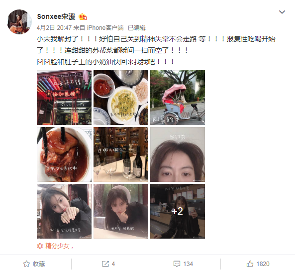 邮件中提到宋湲在3月15日返回苏州时就进入14天的隔离期了,在宋湲的微博中,她最近的一条微博是在4月2日发出的,微博内容就是她解封了,基本和邮件中所回复的信息一致。