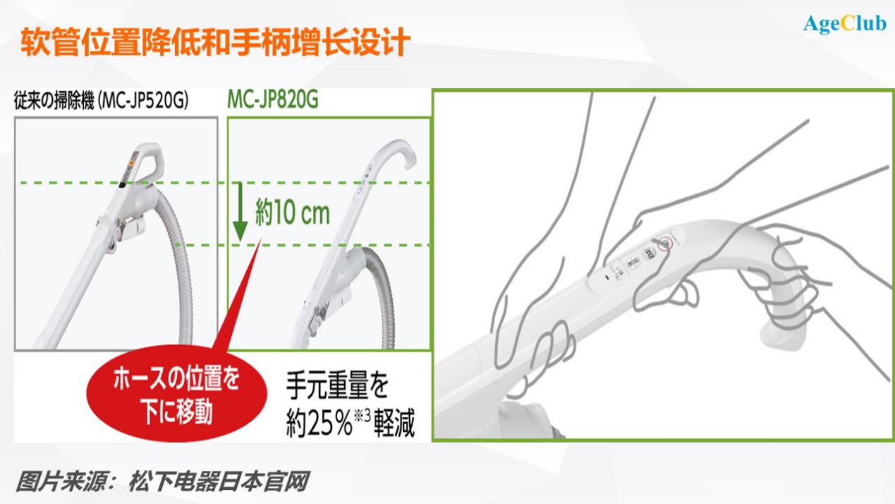 同时松下还将移动软管的位置降低,减轻使用者手的负担;手柄也比传统的真空吸尘器更长,因此老年人使用时可以将手柄靠近身体借力;