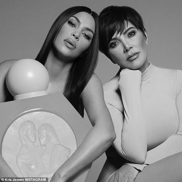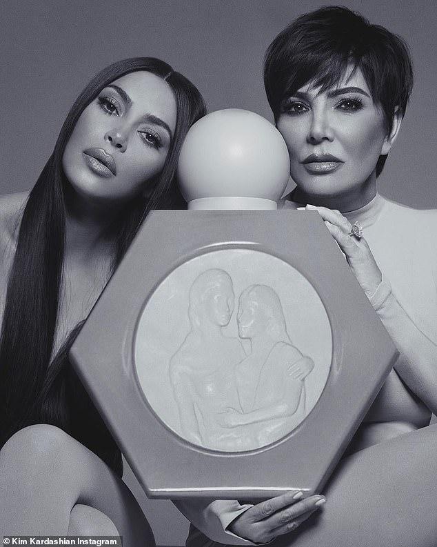 而且,这张照片还有一个细节。卡戴珊抱着香水瓶,长发遮身;妈妈穿的则是Kim的自主品牌。