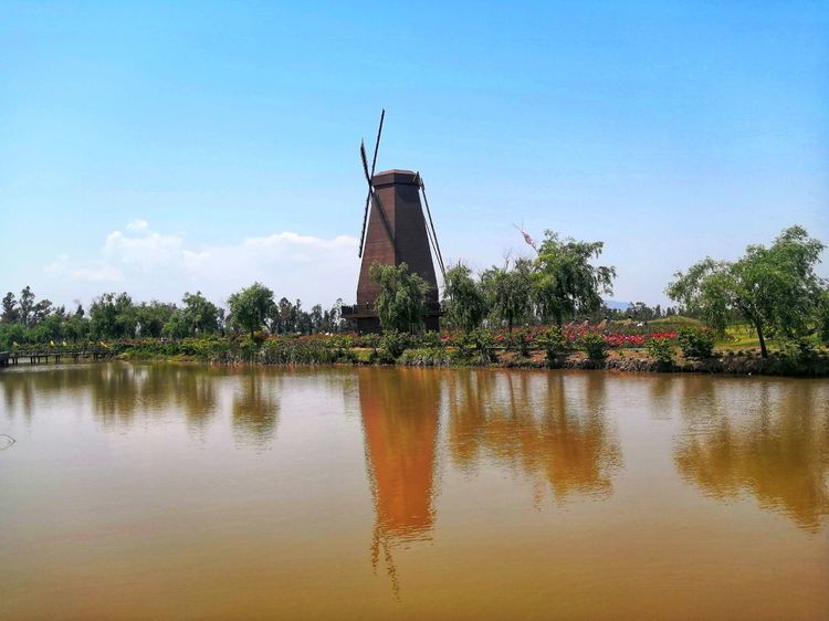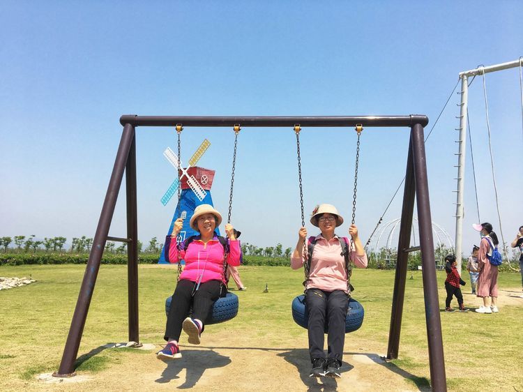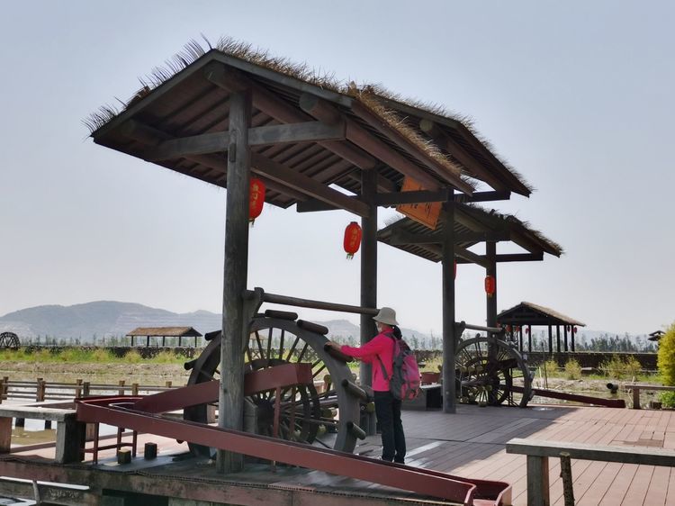 踩水车是项技术活!要两人默契配合,步调一致,才能驾驭这庞然大物。娘俩费了九牛二虎之力才好不容易把大水车踩起来,随着转动的加快,我们就渐渐的踩不准了,不时从大水车上溜下来,惹得大家哈哈大笑!童心未泯的汪姐也上来加入我们的踩水车行列。所以,贪玩不分年龄,就看你有没有一颗不老的童心!
