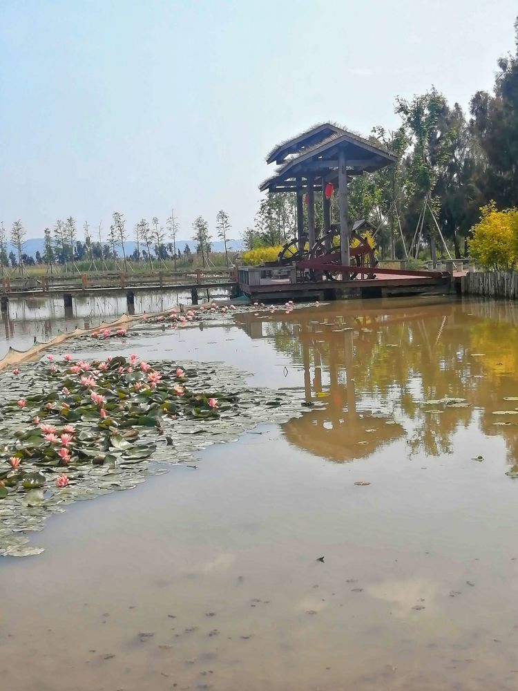 荷塘上的大水车吸引了我们。于是我们就跑过去踩水车。