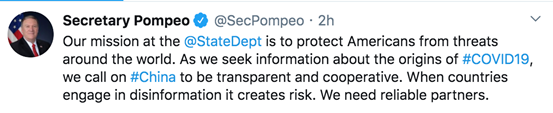 ▲“我们在美国国务院的使命是保护美国人免受来自世界各地的威胁。当我们寻求有关新冠肺炎起源的信息时,我们呼吁中国能够保持透明与合作。当各国参与发布虚假信息时,就会产生风险。我们需要可靠的合作伙伴。”