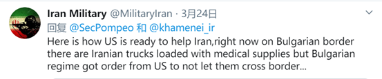 ▲“这就是美国准备向伊朗提供帮助的方式,现在在保加利亚边境,有伊朗卡车装满了医疗用品,但是保加利亚政府从美国得到命令,不要让它们越境。”