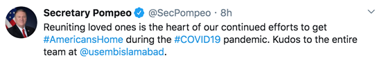 ▲“在新冠肺炎大流行期间,让所爱之人团聚是我们一直努力实现‘带美国人回家’的核心。向美国驻巴基斯坦大使馆的整个团队致敬。”