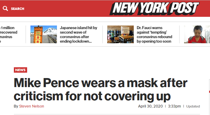 据美国《纽约邮报》4月30日报道,此前因探望新冠病人都没有戴口罩而备受诟病的彭斯,当天在参观位于印第安纳州的一间呼吸机制造厂的时候终于戴上了口罩。