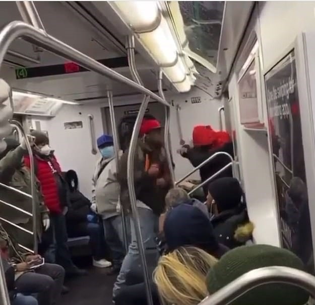 从目击者发布的视频中可以看到,一位头戴红色棒球帽,身穿深色夹克的黑人男子,对靠在地铁门口附近的一名亚裔男子一阵狂殴。黑人男子的双拳不断快速挥动,打在了亚裔乘客的面部。被打的乘客起初想反抗,用双手撑住黑人男子的身体,企图与他拉开距离。但由于自己所处位置不利,加之黑人男子的拳头像雨点般落下,他毫无还手之力。最后,他的口罩被打掉在地上,只能侧着身子躲避不断打在身上的拳头。