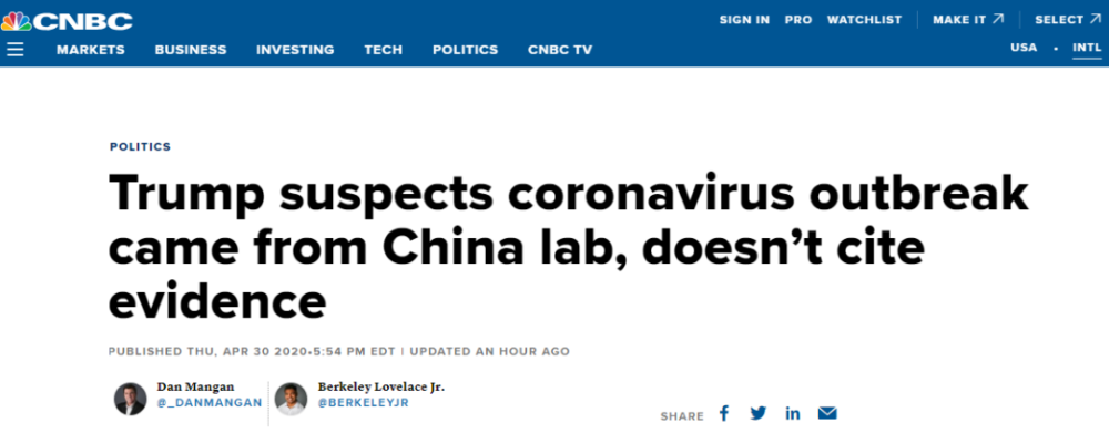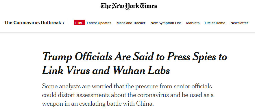 CNBC还提到,也是当天早些时候,《纽约时报》的一篇报道《特朗普政府官员据称施压情报人员将病毒与实验室联系起来》。这篇报道写道,特朗普政府高级官员已要求美国间谍机构寻求证据以支持武汉一个实验室是新冠病毒暴发源头这一“毫无事实根据的理论”。