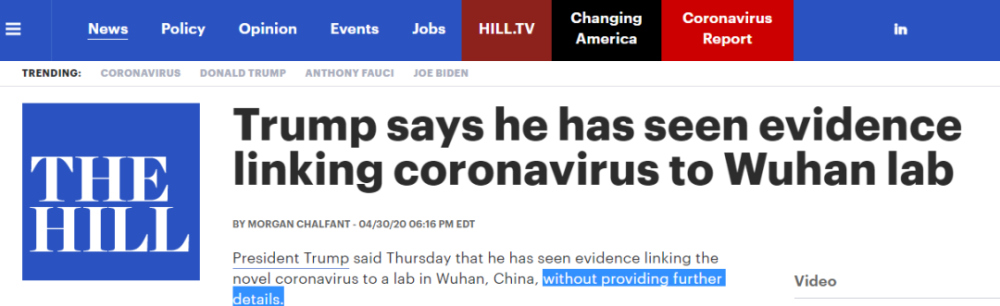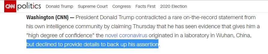 不过,在报道特朗普这番论断时,美媒纷纷强调:他没有提供任何证据或细节。美国消费者新闻与商业频道(CNBC)直接在标题中写道,特朗普怀疑新冠病毒疫情来自中国实验室,(但)没有提供证据。