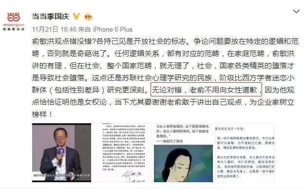 同年俞敏洪在微博上歧视女性的言论引起广大网友气愤,后俞敏洪发微博道歉,本来事情已经过去,结果没两天李国庆又出来力挺俞敏洪。