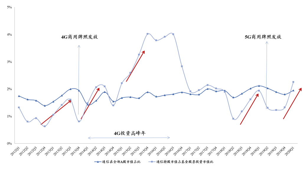 不同于消费行业,通信公司在一季度基金重仓股中的总市值大幅提升。从市场表现来看,5G、数据中心、产业互联网等通信重仓个股一季度涨幅明显。国泰君安通信团队分析原因在于疫情影响下,5G和云计算的双重催化了“新基建”的投资机会。