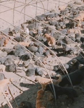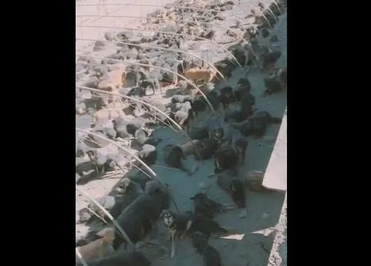 这是一个流浪狗的收容所,里面有各式各样的流浪狗,由于收容所的场地有限,只能把他们围在这个狭小的空间里面,因此狗狗看起来特别的密集。