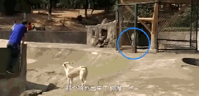 大家去动物园游玩,在观赏狼的同时,竟然意外的发现有条狗狗和狼生活在一起!