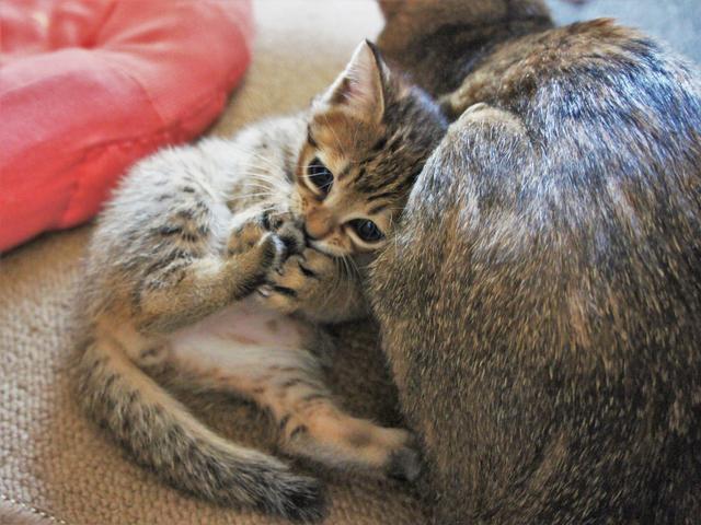 不过Tsumire内心还是小孩子,喜欢粘着猫妈妈,虽然这体型差异有点巨大!