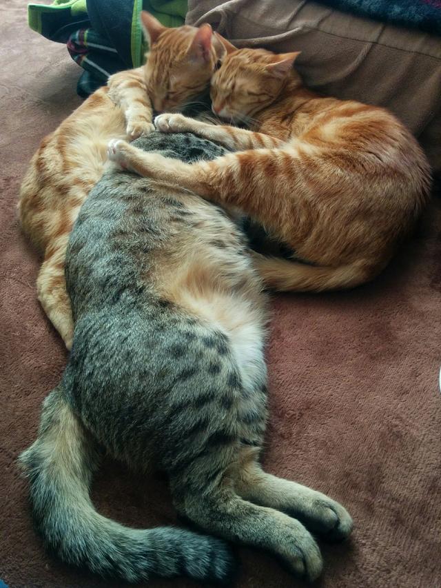 然而Tsumire的两个橘猫哥哥完全不介意,体型大了没什么不好,可以当成肉垫枕头抱着睡觉。