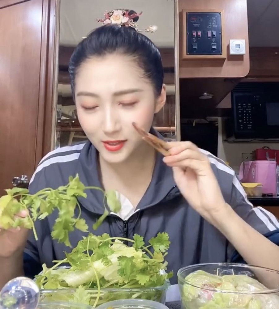 芹菜也不时来一根,一口一根,伴随着关晓彤咀嚼时清脆的声音,让大家觉得这没有蘸料的芹菜也是人间美味。