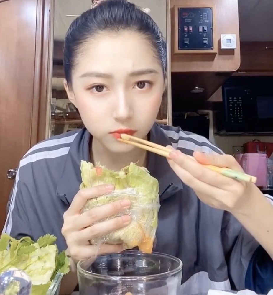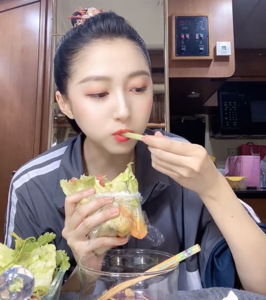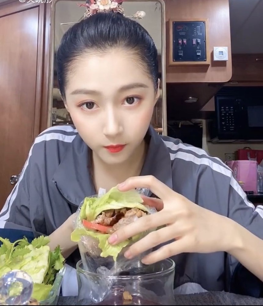 因为太大口,关晓彤嘴巴塞得满满当当,用手拽出边上的生菜看了一眼,又塞回嘴巴里,大概以为自己咬到塑料袋了吧,可爱又接地气,打破了大家对女明星式吃饭的概念。