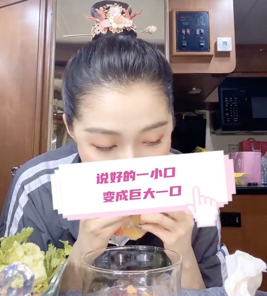 视频中的关晓彤穿着灰色运动服,化着精致的妆容,头发高高束起,发饰是簪子,背景是房车,这应该是关晓彤在拍《二十不惑》的时候,用午饭时间在自己的房车给大家拍的“吃播”。