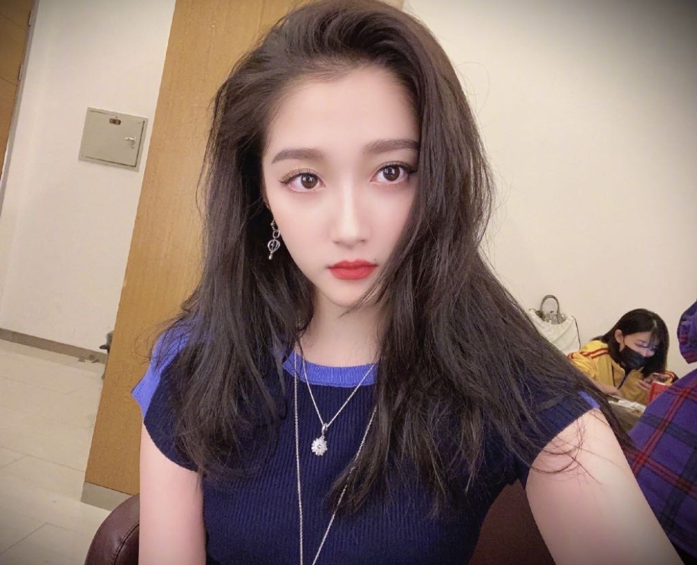 蓝色针织短袖,长发披肩的造型是《王牌对王牌》跳现代舞那一次,好身材让不少人羡慕。