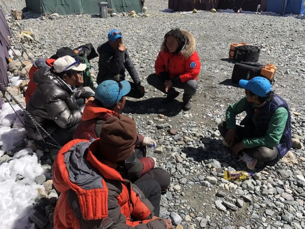 上午,营地里来了8位藏族同胞,他们是珠穆朗玛峰上的背夫。其中一位看上去年纪稍大,其余7位都是二三十岁的小伙子。珠峰大本营再往上,车辆无法通行,所有物质运输都要靠牦牛驼,靠人背。珠穆朗玛峰上的背夫默默无闻,但每次攀登背后都少不了他们的汗水。
