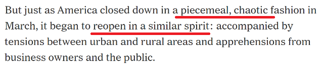 但是,各州在复工过程中却乱象横生,《纽约时报》评价美国各州防疫为“零碎”且“混乱”。