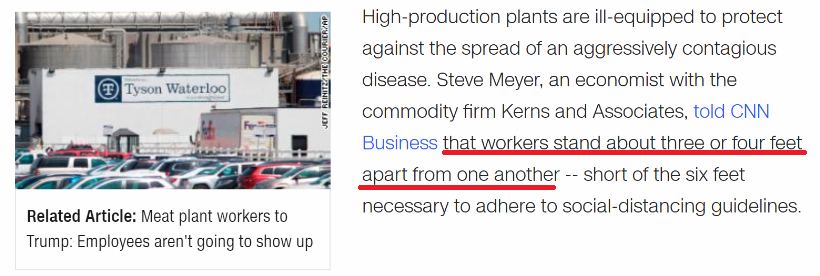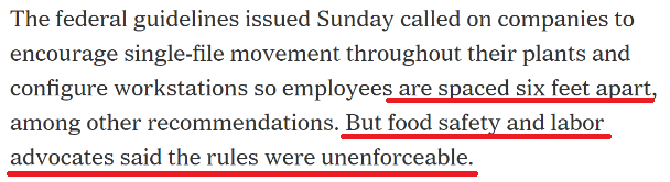 虽然美国联邦政府曾在4月26日出台指导方针,呼吁肉类加工行业人员在作业时的相互间距应达到6英尺,但《纽约时报》指出,指导方针并不是法规,无法真正要求食品公司严格实行。