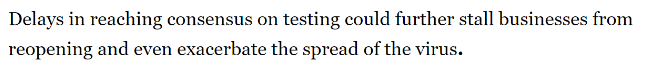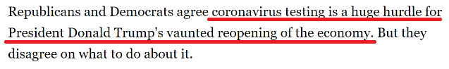共和党与民主党均承认,病毒检测作为指导各州复工的重要先决条件,对特朗普坚持的重启美国计划来说是一个巨大的障碍。但是双方在如何进行检测这一议题上没有达成一致。
