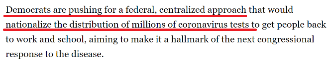 其中,民主党寻求一种联邦集中化的方法,联邦政府对防疫工作统一指挥管理,从而加强检测,进而引导复工。