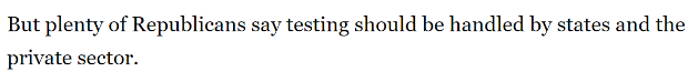而共和党则坚决反对将防疫作为联邦政府的统一行为,认为各州应当负起责任。共和党希望通过私人企业,解决防疫问题。此外,共和党认为国会已经在此前的支出计划中组织领导了测试工作,在进一步投入之前,应当先查看结果。最终,特朗普肯定了这一方案,要求各州州长负责各州的测试。