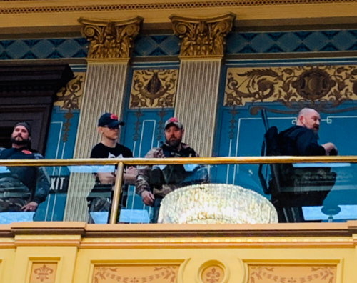 △密歇根州民众在州议会大楼内持枪示威 要求民主党领导人放松管制开始复工(图片来源于社交媒体)