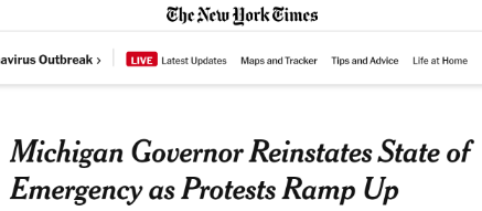 △《纽约时报》5月1日发布“密歇根州州长恢复‘紧急状态’”的相关报道