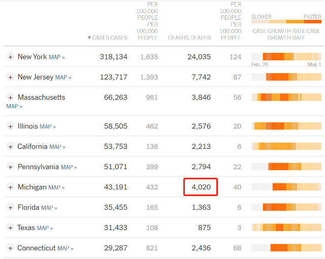 △截至5月3日 密歇根州新冠肺炎死亡病例(图片来源:《纽约时报》)