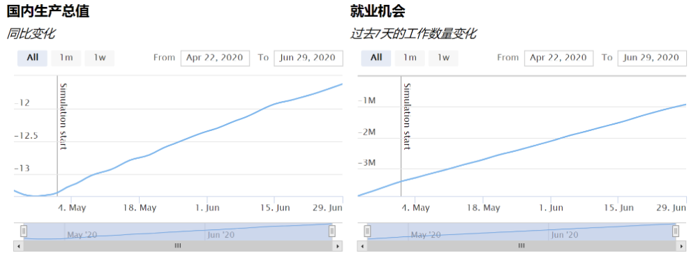 据宾夕法尼亚大学5月1日公布的复工模型测算,此次重启计划将从预计未来两个月失去的1400万个工作岗位中拯救约440万个工作岗位,美国国内生产总值(GDP)将比上年同期下降10.7%。2020年6月30日的国内生产总值将比不重新开放时增长1.5%左右,自5月1日以来几乎所有的失业率都将恢复。