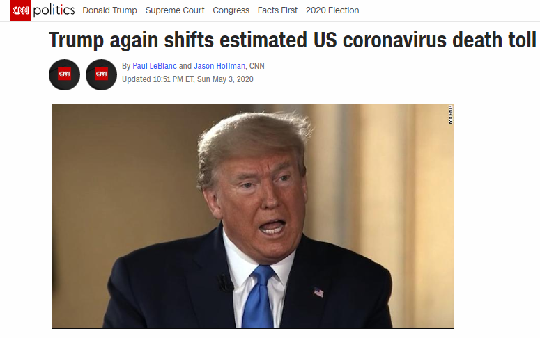 CNN称,特朗普在不到两周前4月底的一次白宫新闻发布会上预测,美国死于冠状病毒的人数将在5万至6万人之间。