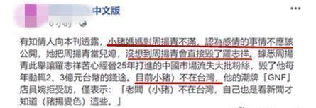 有台媒报道称,小猪妈妈对周扬青手撕儿子的行为不满,认为自己把周扬青当儿媳看待,她不该公开直接毁了罗志祥。对于妈妈的发言,罗志祥本人当时并未回应。