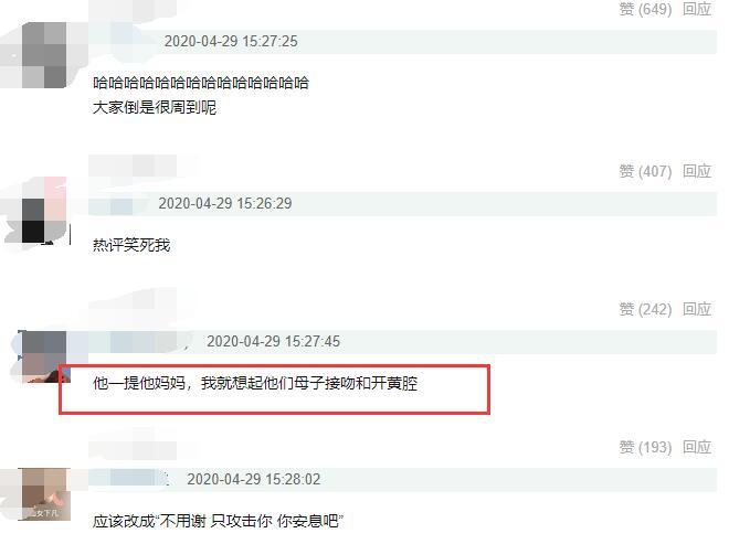 但网络评论似乎仍然不太友好,网友纷纷评论到:“他一提起他妈妈,我就想起他们母子接吻和开黄腔”、“应该改成不用谢,只攻击你,你安息 吧”、“热评笑死我”!