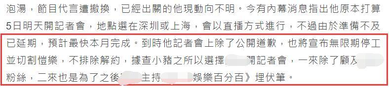 而小猪未来将要面临如何的局面也备受关注,据悉周扬青曝出分手消息时,小猪刚到深圳隔离,目前应该已过了隔离期。5月4日据台媒报道称收到内幕消息称他原本打算在5日,也就是明天召开记者会,地点选在深圳或上海,并且会以直播方式进行,不过由于准备不及已延期,但预计最快会在本月完成。到时候,他在记者会上除了公开道歉意外,也会宣布无限期停工并切割蝴蝶姐姐恺乐,而且不排除与她解约。
