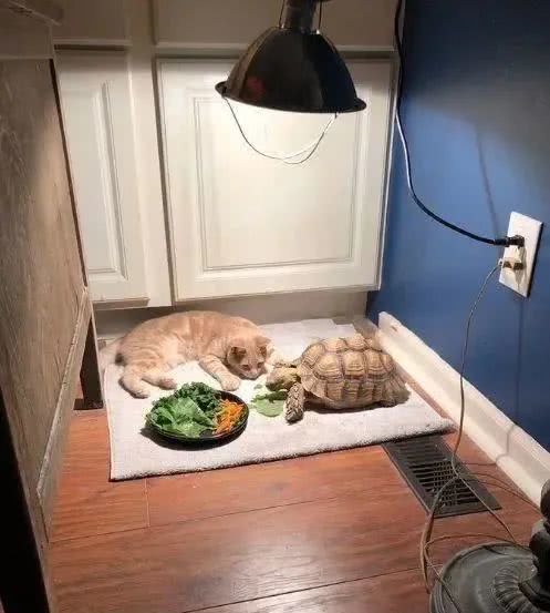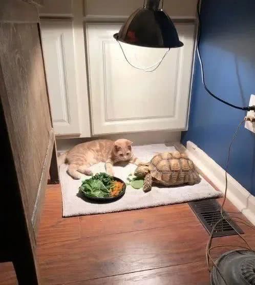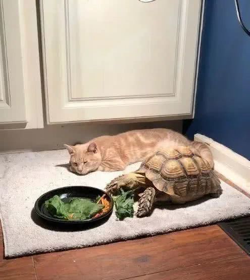 有了乌龟的陪伴,猫咪也算是找到了一个伴,它很喜欢趴在乌龟旁边。这不,某天猫咪又趴在乌龟旁边了,还围观它吃饭。不用担心猫咪会对乌龟的食物感兴趣,因为都是素的。