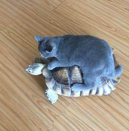这只猫咪就把乌龟当成了坐骑,是不是感觉龟壳很结实很有安全感?这样的猫咪才像正确的打开方式嘛。
