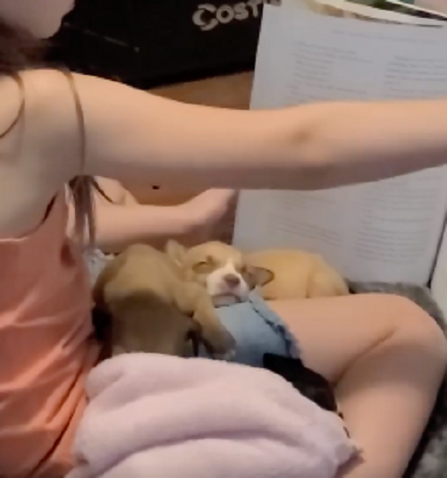小主人将这3只狗狗放在了自己的怀中,并在面前摆上了一大本童话故事书,就这样在狗狗们的耳边轻念着书中的故事。
