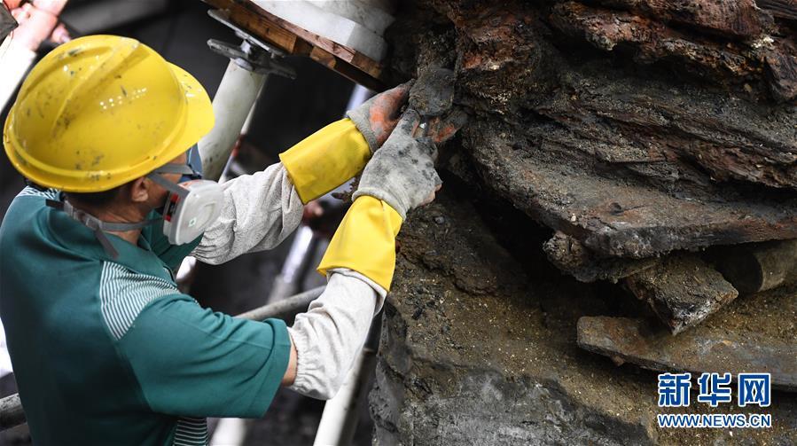 这是位于广东阳江海陵岛的“南海I号”已清理出的船艉部分(5月12日摄)。 新华社记者 邓华 摄